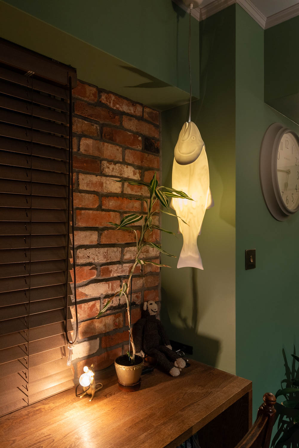 中でも象徴的なのが、カウンターに置かれた「ネズミのライト」や、ドイツから個人輸入された鮭型のオランダ製ライト。機能と遊び心が共存するその姿に、明神さんの暮らしへのまなざしが垣間見えます。