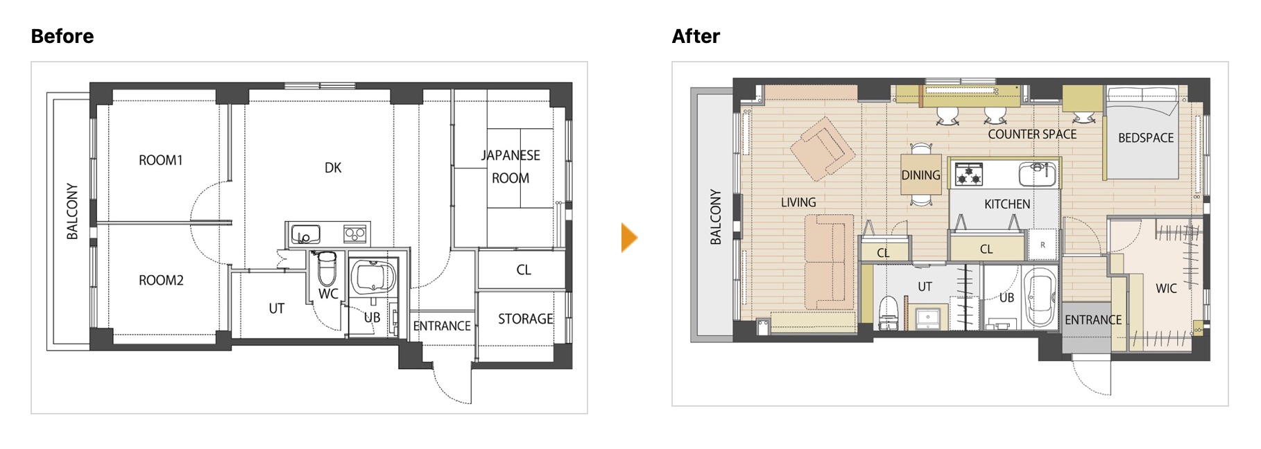 この哲学は、今回手がけた築47年の団地リノベーションの根幹を支えるものとなりました。“古さ”とされる要素も、排除するのではなくデザインの一部として迎え入れる。そうした発想は、ロンドンで培われた感性がそのまま投影されたものでした。