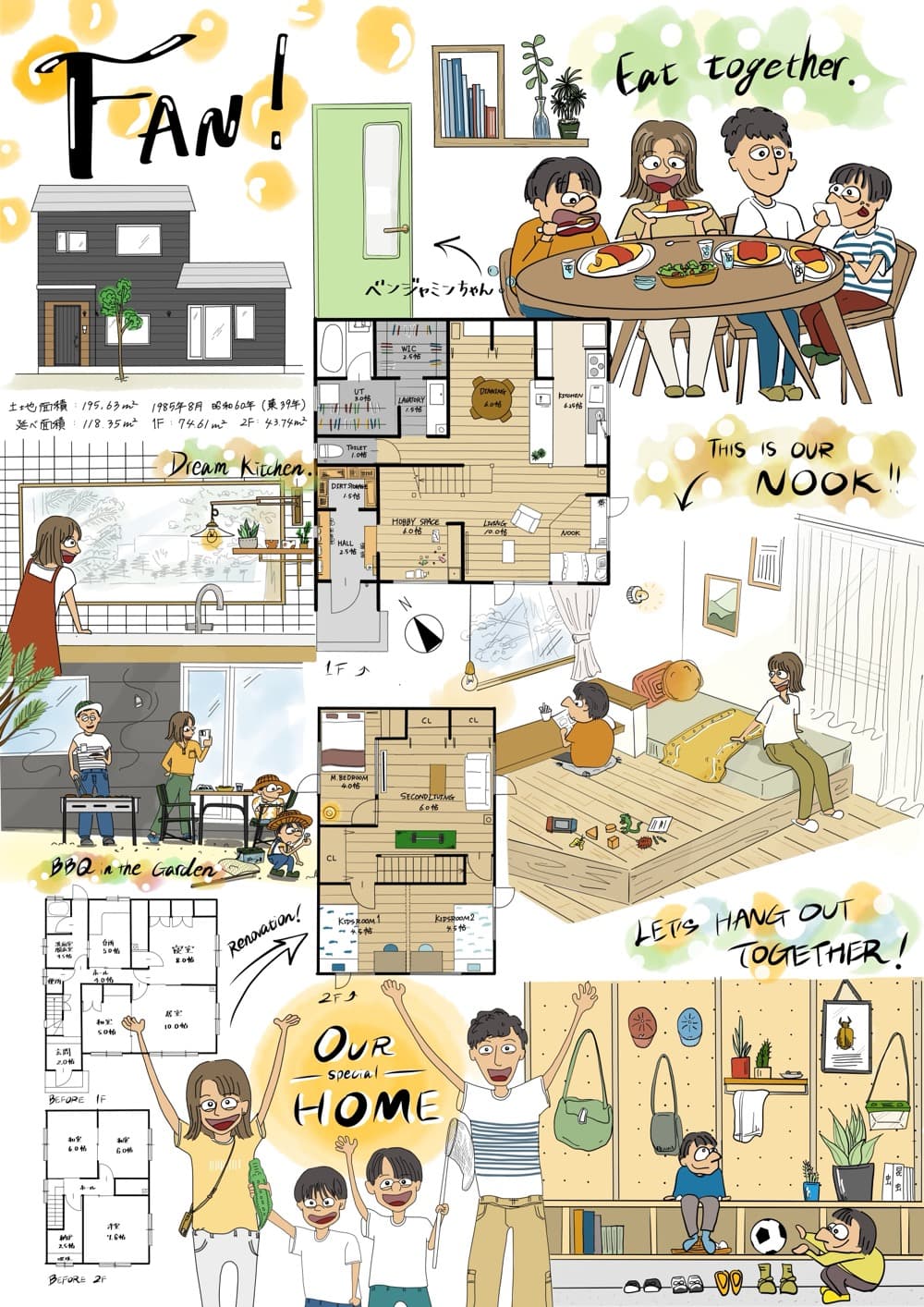 「Fan!」は中島さんのこれから始まる暮らしのテーマ。「面白味」、「人と人が戯れる」、「楽しい」などの意味を持つ言葉が、ご家族の仲睦まじい様子を連想させてくれること、加えて奥さんの詩織さんがずっと前からRENOVESのファンでいてくださったこともあり、このテーマを付けられました。
