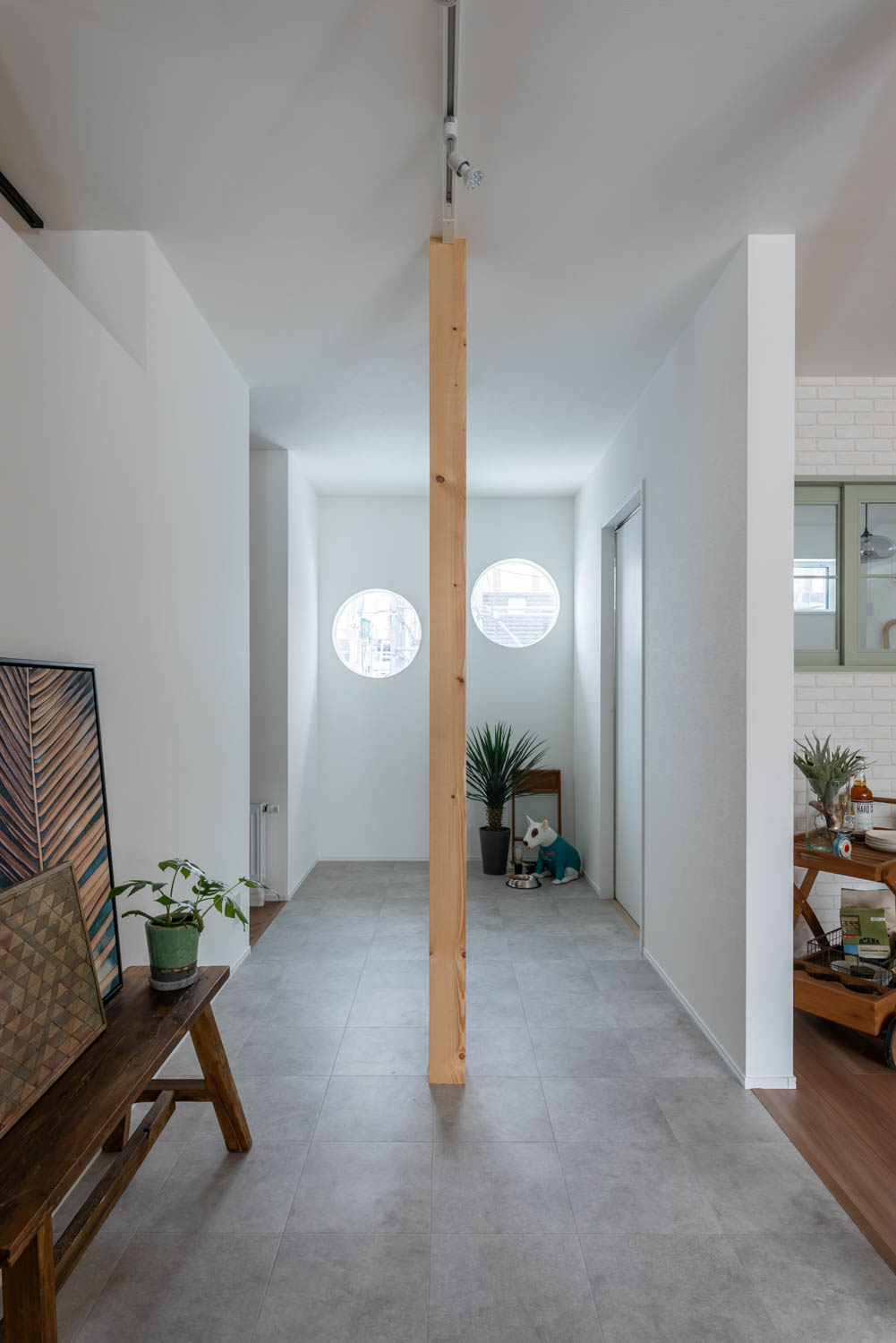 玄関を抜けると、視線の先には高さ違いの丸窓が2つ。シンプルに作られた空間の中に、その可愛らしい丸窓がとても印象的に映ります。