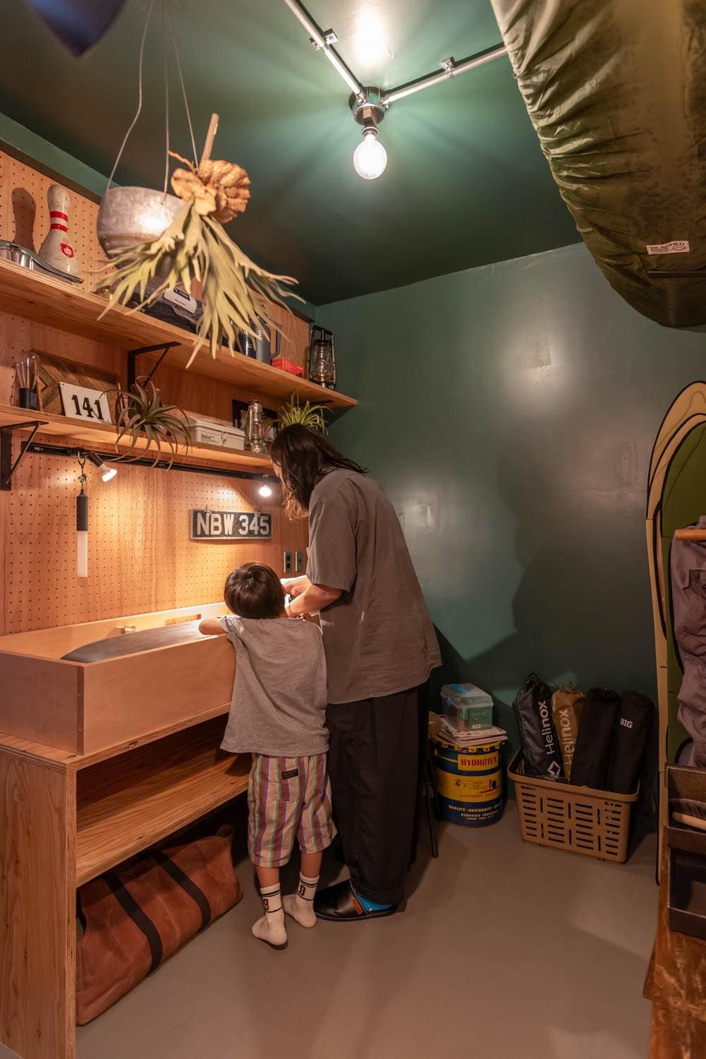 冬の間はワックス台の箱をカウンター上に取り出して使い、オフシーズンはカウンター下にしまっておける仕様になっています。ここにはご主人の好きなものしかありません。スノーボードにサーフィン、キャンプ道具から漫画やゲーム。好きな空間を好きなもので埋め尽くしそこで過ごす楽しみ。想像しただけでニヤけてしまいそう。