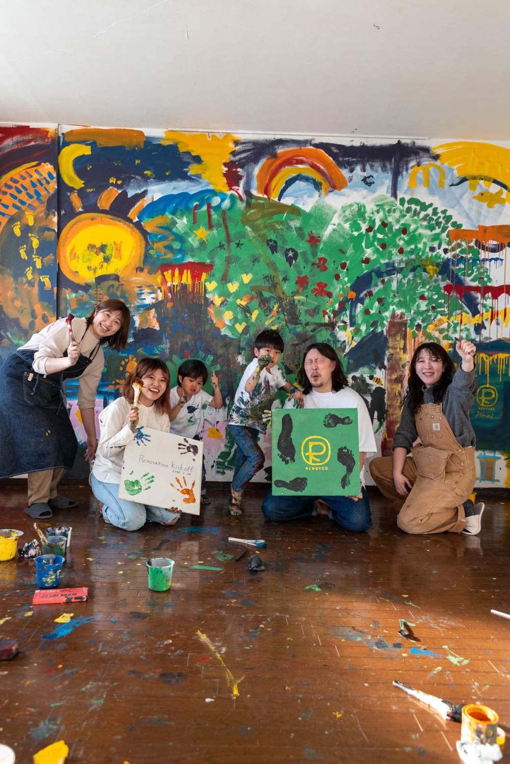 工事が始まる前に「着工式(キックオフ式)」と名付け着工前のお部屋の壁一面に絵を描くことに。壁いっぱいに描かれた一枚の絵。大人も子どもも夢中で色を重ねていきます。